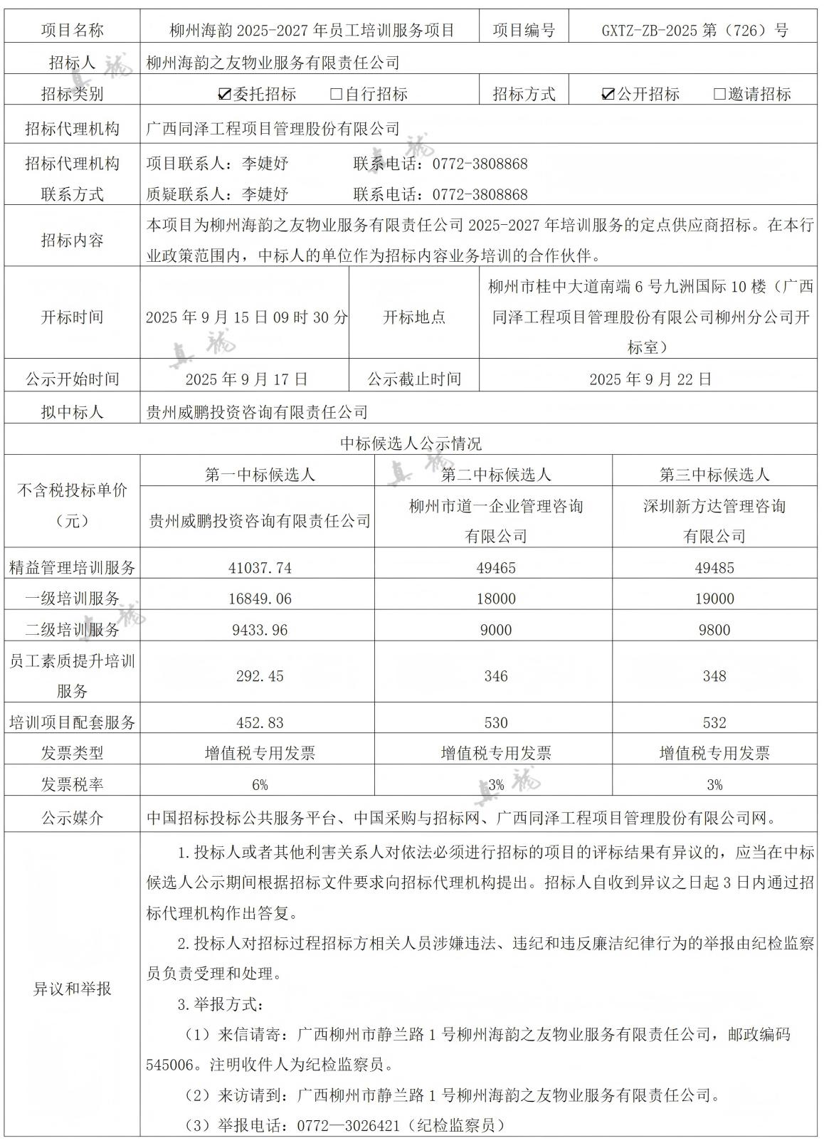 柳州海韻之友物業(yè)服務(wù)有限責(zé)任公司柳州海韻2025-2027年員工培訓(xùn)服務(wù)項目(項目編號:GXTZ-ZB-2025第(726)號)中標(biāo)候選人公示